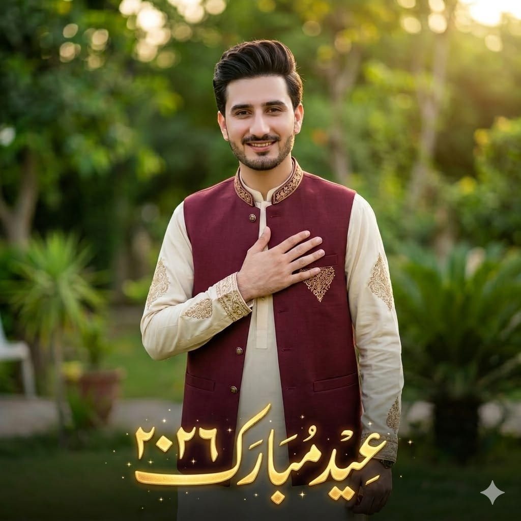 Transform the exact person from the uploaded reference photo — keep 100% accurate face, skin tone, eyes, hair, expression, pose and body features. Dress them in premium stylish cream or off-white Pakistani shalwar kameez with delicate golden embroidery on collar and sleeves, perfectly paired with a modern fitted maroon or navy designer waistcoat.Professional portrait composition (head to waist, vertical framing). Natural outdoor background with lush green garden, trees, plants and soft grass, heavily blurred with dreamy creamy bokeh effect, shallow depth of field, 85mm lens style. Soft warm golden hour sunlight filtering through the leaves. New pose: confident standing pose with slight head tilt, right hand placed gracefully on heart in respectful Eid greeting, warm confident smile looking at camera.Elegantly place luxurious glowing golden traditional Urdu calligraphy text “عید مبارک ۲۰۲۶” at the bottom center with subtle sparkle effect. Ultra photorealistic, highly detailed skin and fabric texture, sharp