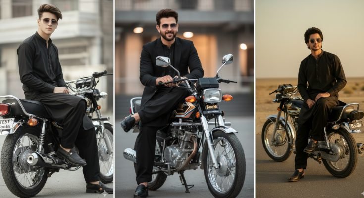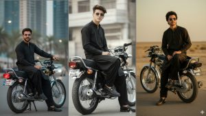 "Hyper-realistic cinematic full-body portrait of the same young man (face unchanged) sitting casually on a shiny black Pakistani version Honda CG 125 gold edition motorcycle with chrome details, wide tires, and a visible rear plate with custom test BooBi. He wears an uploaded dress like Black Shalwar Kameez, clean light fade sunglasses Relaxed pose, one leg crossed, 100% face matching (unchanged face). Same and original face 100%”